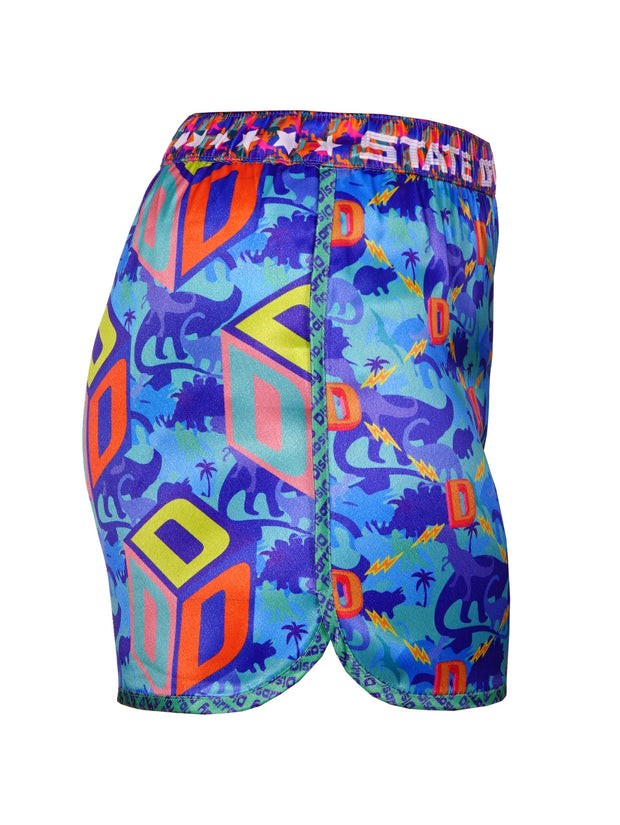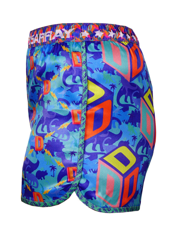 Dinosaurs, lightning bolts, shooting stars, palm trees and play-blocks all rolled into one incredible pair of jazzy gym shorts of dreams!